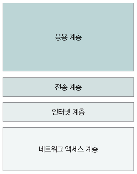 두 번째 계층인 ➋ 인터넷 계층internet layer은 OSI 모델의 네트워크 계층과 유사하며, ➌ 전송 계층transport layer은 OSI 모델의 전송 계층, ➍ 응용 계층application layer은 OSI 모델의 세션 계층, 표현 계층, 응용 계층을 합친 것과 유사합니다.