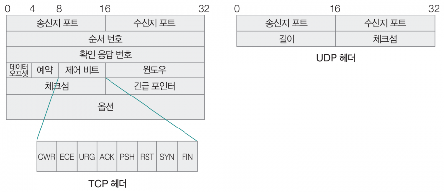 네트워크를 통해 송수신되는 패킷은 전송 도중에 유실될 때도 있고, 순서가 뒤바뀔 때도 있습니다. 전송 계층transport layer은 이러한 상황에 대비해 신뢰성 있는 전송을 가능하게 하는 계층입니다. 또한 포트port라는 정보를 통해 특정 응용 프로그램과의 연결 다리 역할을 수행하는 계층이기도 합니다. 전송 계층에 속한 대표적인 프로토콜에는 TCP와 UDP가 있습니다.