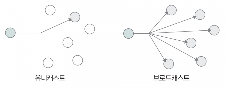 수신지와 수신지가 일대일로 메시지를 주고받는 전자의 전송 방식을 유니캐스트unicast라고 하고, 네트워크상의 모든 호스트에게 메시지를 전송하는 후자의 전송 방식을 브로드캐스트broadcast라고 합니다. 이때 브로드캐스트가 전송되는 범위를 브로드캐스트 도메인broadcast domain이라고 하며, 호스트가 같은 브로드캐스트 도메인에 속해 있는 경우에는 같은 LAN에 속해 있다고 간주합니다.