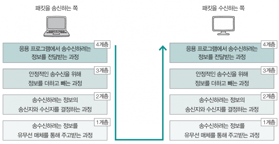 - 패킷을 송신하는 쪽에서는 상위 계층에서 하위 계층으로 정보를 보내고, 패킷을 수신하는 쪽에서는 하위 계층에서 상위 계층으로 정보를 받아들인다.