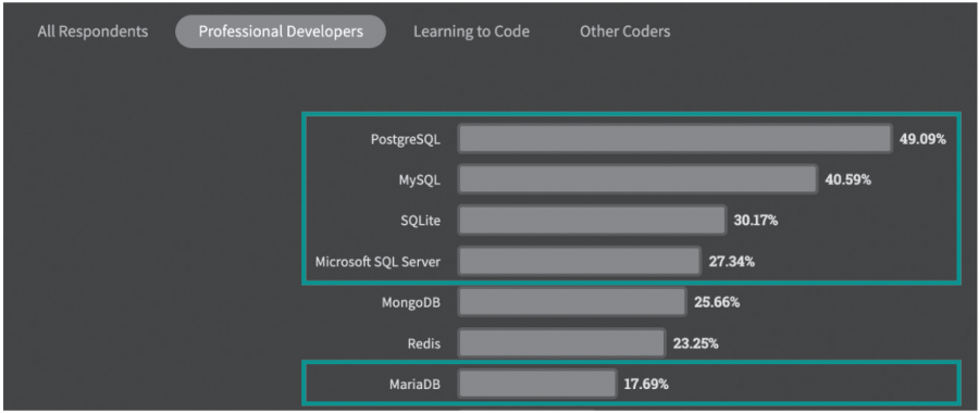 다음은 2023년 약 6만 명의 전문 개발자를 대상으로 진행한 설문조사의 결과입니다. 답변 결과를 살펴보면 PostgreSQL의 점유율(49.09%)이 가장 높은 것으로 보이지만, 7위로 꼽힌 MariaDB(17.69%)는 2위 MySQL(40.59%)의 오픈소스 버전에 해당하므로 점유율이 가장 높은 RDBMS는 사실상 MySQL입니다.