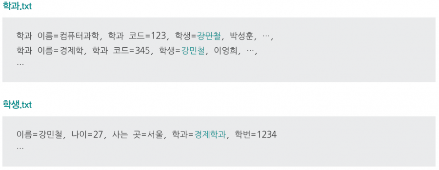 다량의 데이터 관리에 있어 불필요한 중복 저장은 스노우볼이 되어 큰 저장 공간 낭비로 이어질 수 있습니다. 파일로 다량의 데이터를 관리할 경우, 불필요한 중복 저장이 발생하기가 쉽습니다. ‘학과.txt’와 ‘학생.txt’ 파일에서 ‘학과 이름=’과 ‘학과 코드=, 학생=, 이름=, 사는 곳=, 학과=, 학번=’은 모두 굳이 중복 저장할 필요가 없는 정보입니다. 또 ‘학과.txt’의 ‘학생=’은 ‘학생.txt’의 ‘학생=’ 데이터와 중복된 저장이죠.