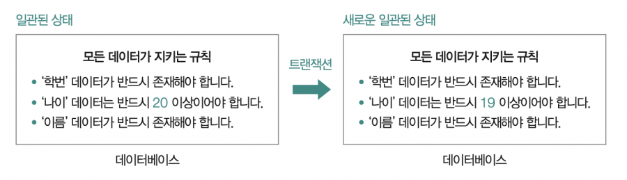 트랜잭션 전후로 데이터베이스가 일관된 상태를 유지하는 성질을 일관성Consistency이라고 합니다. 여기서 ‘일관된 상태’란 데이터베이스가 지켜야 하는 일련의 규칙들을 지키는 상태를 의미합니다. 이러한 규칙(일관성)을 깨뜨리지 않는 데이터를 유지하는 성질이 바로 데이터베이스의 일관성입니다. 유의할 점은 데이터베이스가 트랜잭션 이후 다음과 같이 새로운 일관된 상태로 전이될 수 있다는 것 입니다. 다만, 이 경우에도 저장된 데이터들은 모두 일관된 상태를 유지해야 합니다.
