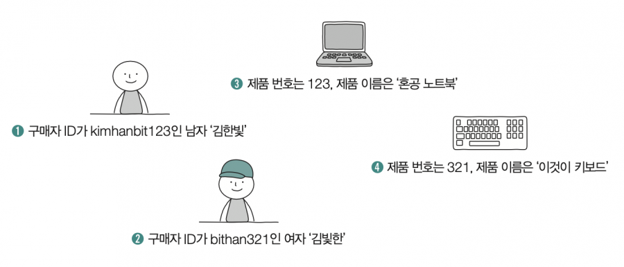 ➊ 구매자 ID 속성=123, 구매자 이름 속성=‘김한빛’, 구매자 성별 속성=남자