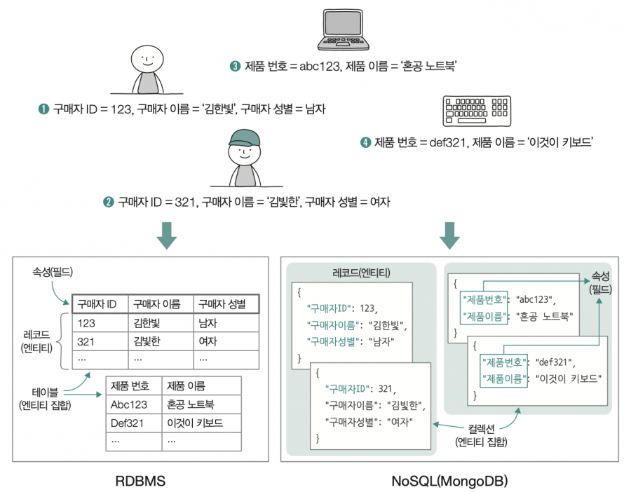 RDBMS에서는 개별 레코드를 테이블의 행으로 표현하고, 필드를 테이블의 열로 표현합니다. 또한 NoSQL DBMS인 MongoDB에서는 개별 레코드를 Json 형태의 데이터인 도큐먼트document라는 단위로 표현하고, 필드를 Json 키의 형태로 표현합니다.