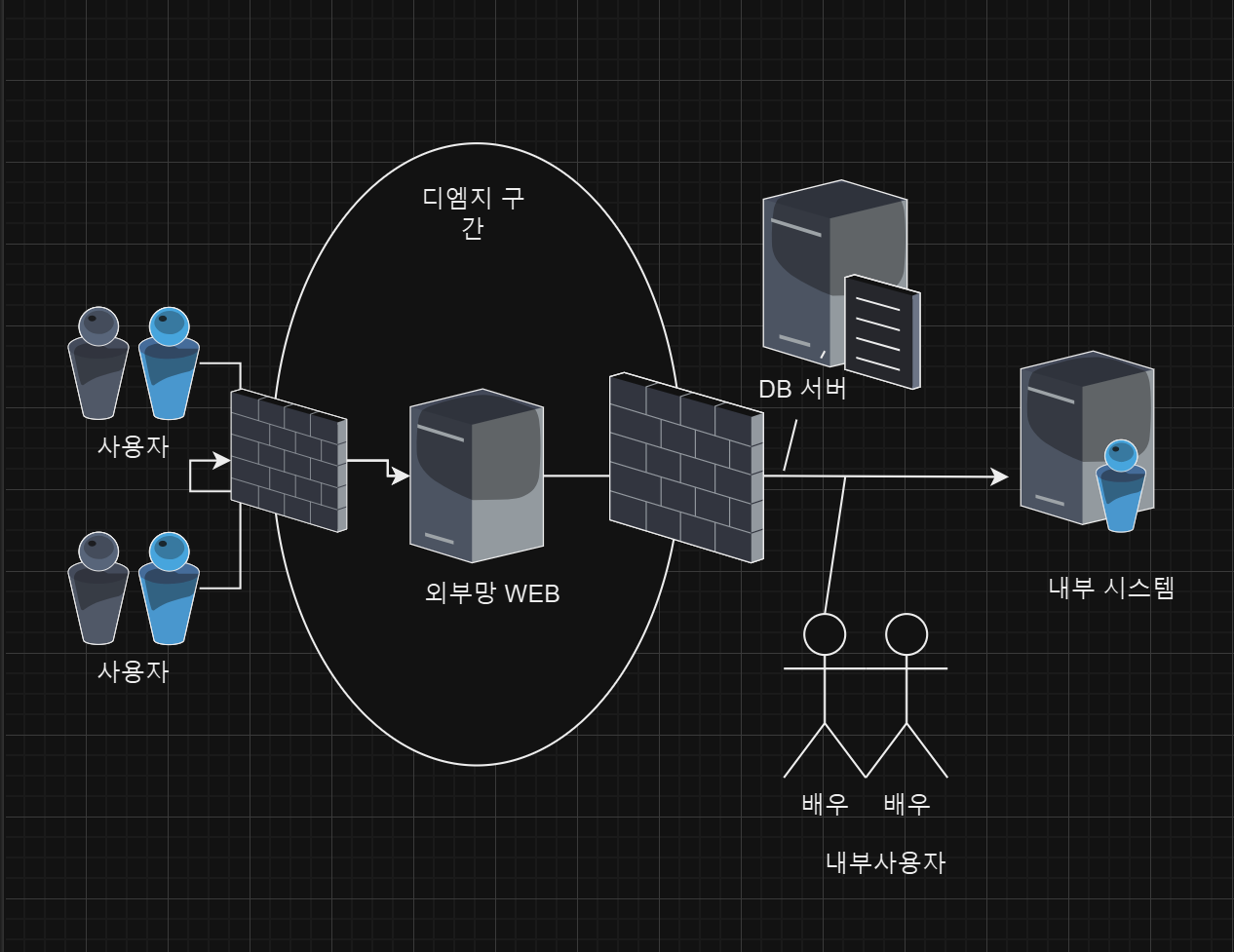내부망: (절대 방어 영역)물리적 망분리, 접근통제시스템등에 의해 인터넷 구간에서의 접근이 통제 또는 차단되는 구간이다.
